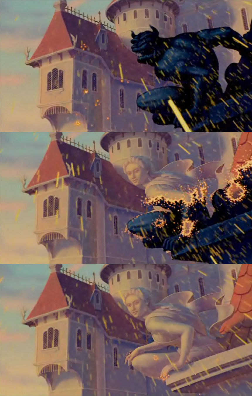 Finally, my favourite shot in the film – at which I remember cheering as a child every time it played – comes in the finale, during Beast’s transformation into Prince Charming. Pointedly, the transformation is not limited to Beast and his servants, but their residence is prominently featured as well. Here, as the golden raindrops fall on the castle, the dark Gothic grotesques change shape into innocent saints.