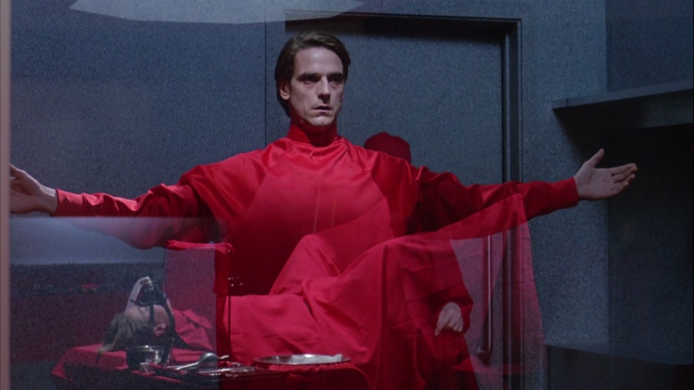 This structure owes much to the perfectly cast Jeremy Irons, whose icy visage withholds emotions from the audience despite two superb, layered performances as the twin gynecologists. Irons opens himself up, breaks himself apart, moulds it all back together, and yet, there’s always a certain distance. He is the core of the film’s eerie atmosphere at all times by remaining impenetrable and emotionally unpredictable, as if no amount of crying with a broken heart can convince us that he’s human until we see him bleed. And even then, one wonders whether he has become any more accessible or is really just a mutant man being operated on by instruments for mutant women.